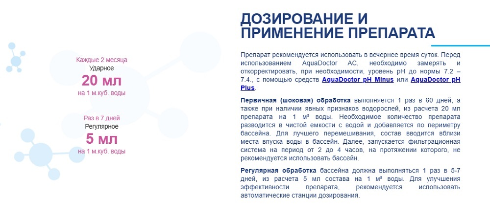 Регулярная обработка: 5 мл на 1 м³ воды / 1 раз в 7 дней