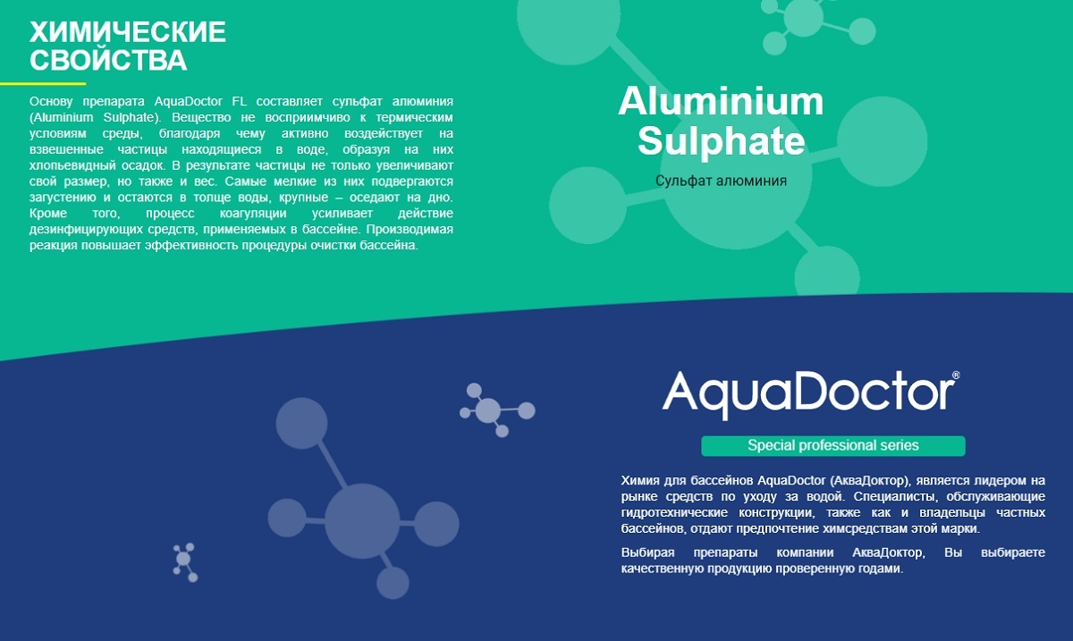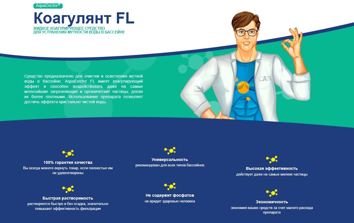 Средство предназначено для очистки и осветления мутной воды в бассейне. Препарат AquaDoctor FL имеет коагулирующий эффект и способен воздействовать даже на самые мельчайшие загрязняющие и органические частицы, делая их более плотными. Использование препарата позволяет достичь эффекта кристально чистой воды.