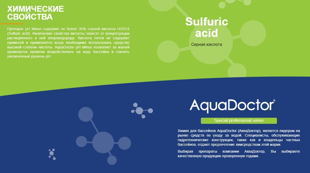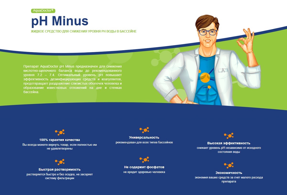 Жидкий состав AquaDoctor pH- Minus для понижения показателя кислотно-щелочного баланса воды в бассейне. Рекомендовано использовать при значении pH выше 7.4. Нормальным значением уровня кислотно-щелочного баланса воды бассейна считается 7.2-7.4. Вода с оптимальным уровнем pH увеличивает эффективность дезинфицирующих средств и коагулянтов. Она также предотвращает раздражение слизистых оболочек человека и выпадение известковых отложений на дне или стенках бассейна. Жидкая консистенция позволяет использовать состав как для ручного, так и для автоматического дозирования в воду (через насосы-дозаторы). Изготовлено на основе серной кислоты.