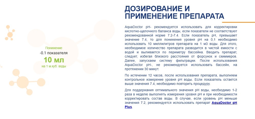 Для снижения уровня pH на 0.1:: добавить 10 мл средства на 1 м³ воды