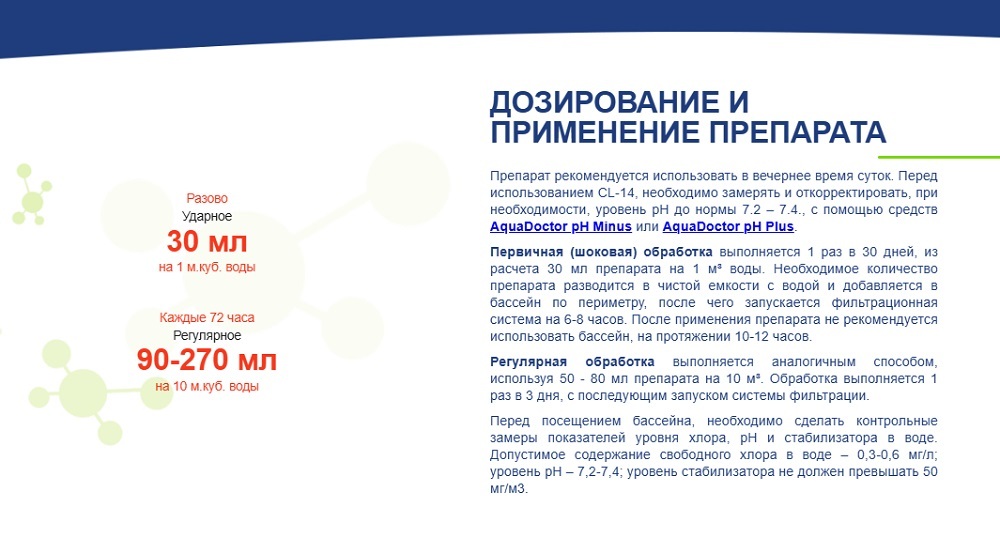 Регулярная обработка: 5-8 мл на 1 м³ каждые 3 дня