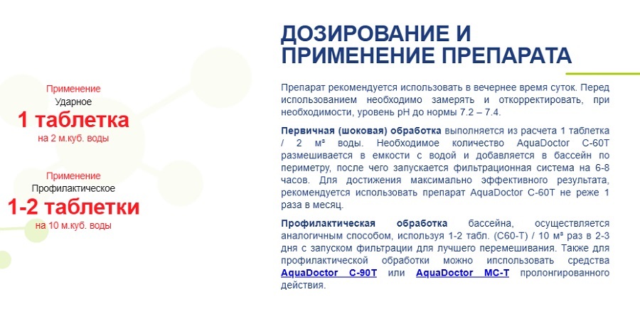 Регулярная обработка: 1-2 таблетки на 10 м³, каждые 2-3 дня